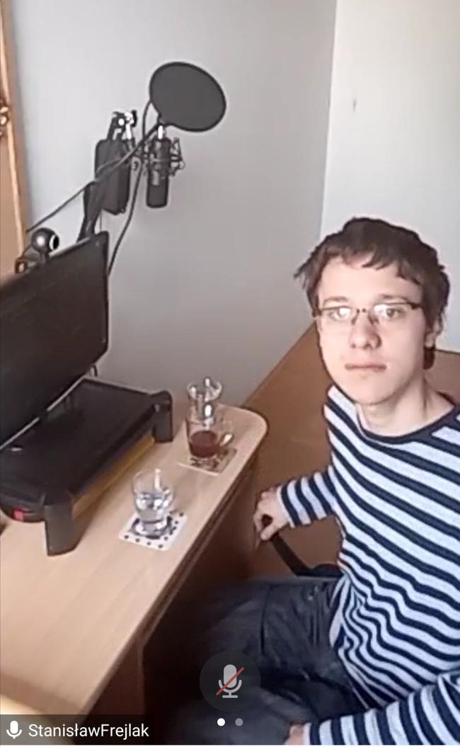 线上比赛,有了视频的参与,带来了全新的体验,远隔千里的对局双方仿佛一下子坐到了同一张棋盘前切磋棋艺。欧洲选手在大部分时间中保持着曲腿的坐姿,桌上放着两杯水(也可能是酒),还有杯托相衬,很是考究。大约在棋局进行到一半的时候,Stanis?aw Frejlak,已经把一杯水喝完了。这个细节对复旦围协的王致远来说同样如此,他在整个比赛的过程中也频繁地喝水,足见棋盘中战斗的火热。