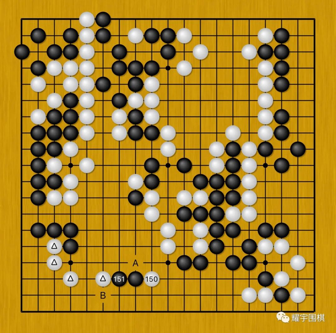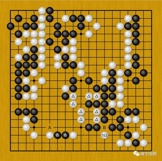 图8:一力辽没有选择简明的A位长,而是下出了白152点,意思是我下一手要B位断了,你谢科赶紧给我B位粘回去。
