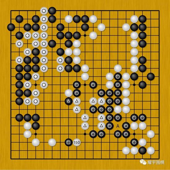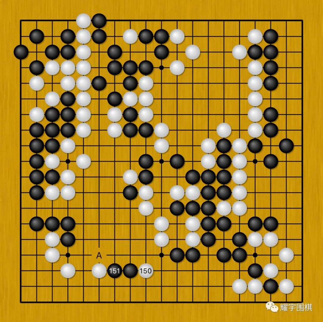 图4:谢科使出了黑151横顶的手段,这步棋相对于A位长,更强调对左下白三角四子的压迫。