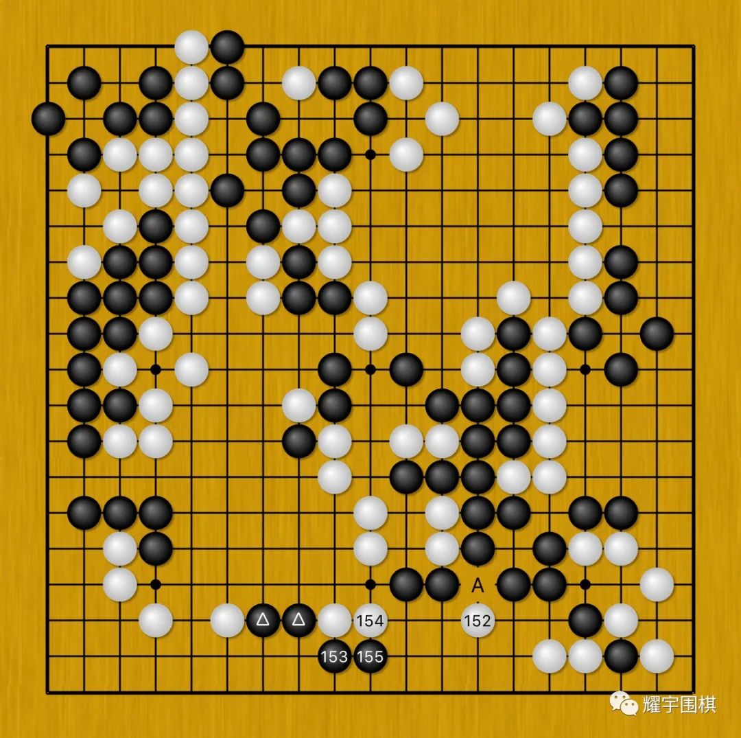 图15:白152完全没有必要,只需要简单在A位一长,让黑两子好好当被告,然后白三角大块顺势加强,就可简明获胜。