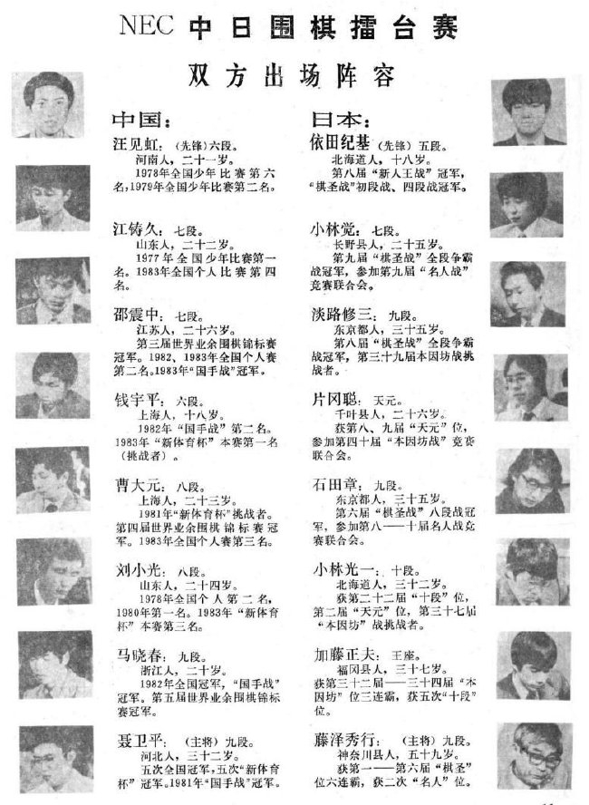 中方出场顺序为:汪见虹(先锋)、江铸久、邵震中、钱宇平、曹大元、刘小光、马晓春、聂卫平(主将);日方则为:依田纪基(先锋)、小林觉、淡路修三、片冈聪、石田章、小林光一、加藤正夫、藤泽秀行(主将)。