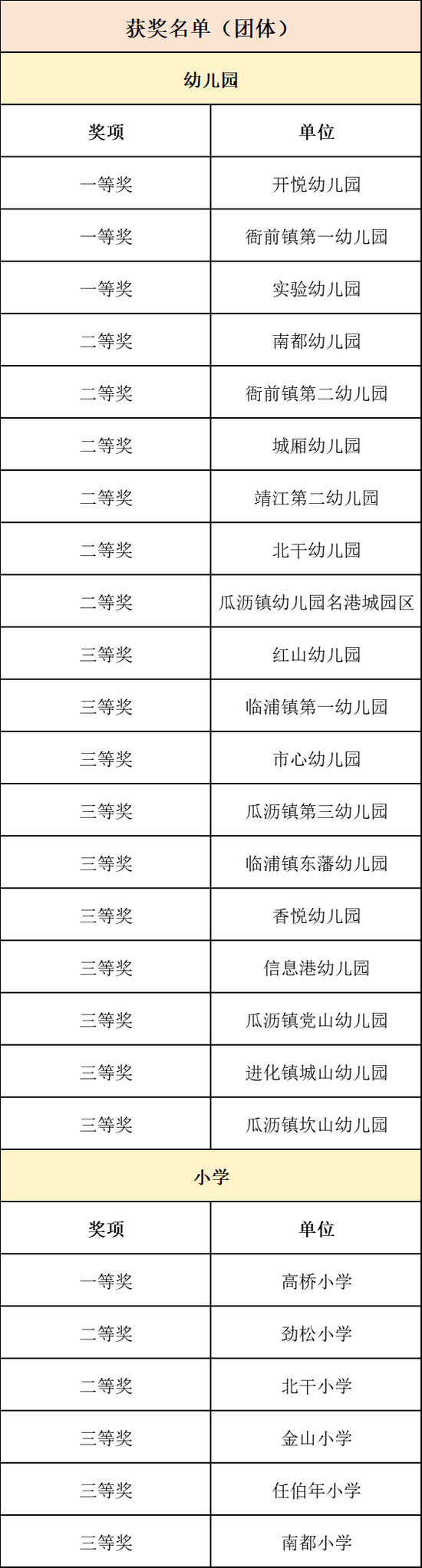 开诚幼儿园、瓜沥镇幼儿园、瓜沥镇长沙幼儿园、靖江中心幼儿园、汇宇幼儿园、瓜沥镇第二幼儿园、美之幼儿园、童蒙幼儿园、瓜沥镇光明幼儿园、南阳第三幼儿园、瓜沥镇七彩幼儿园、宁围中心幼儿园、机关幼儿园、西山幼儿园、高桥幼儿园