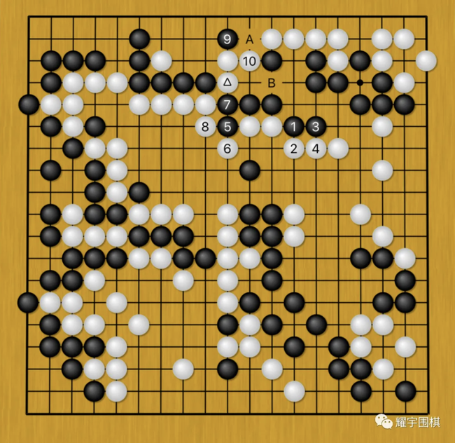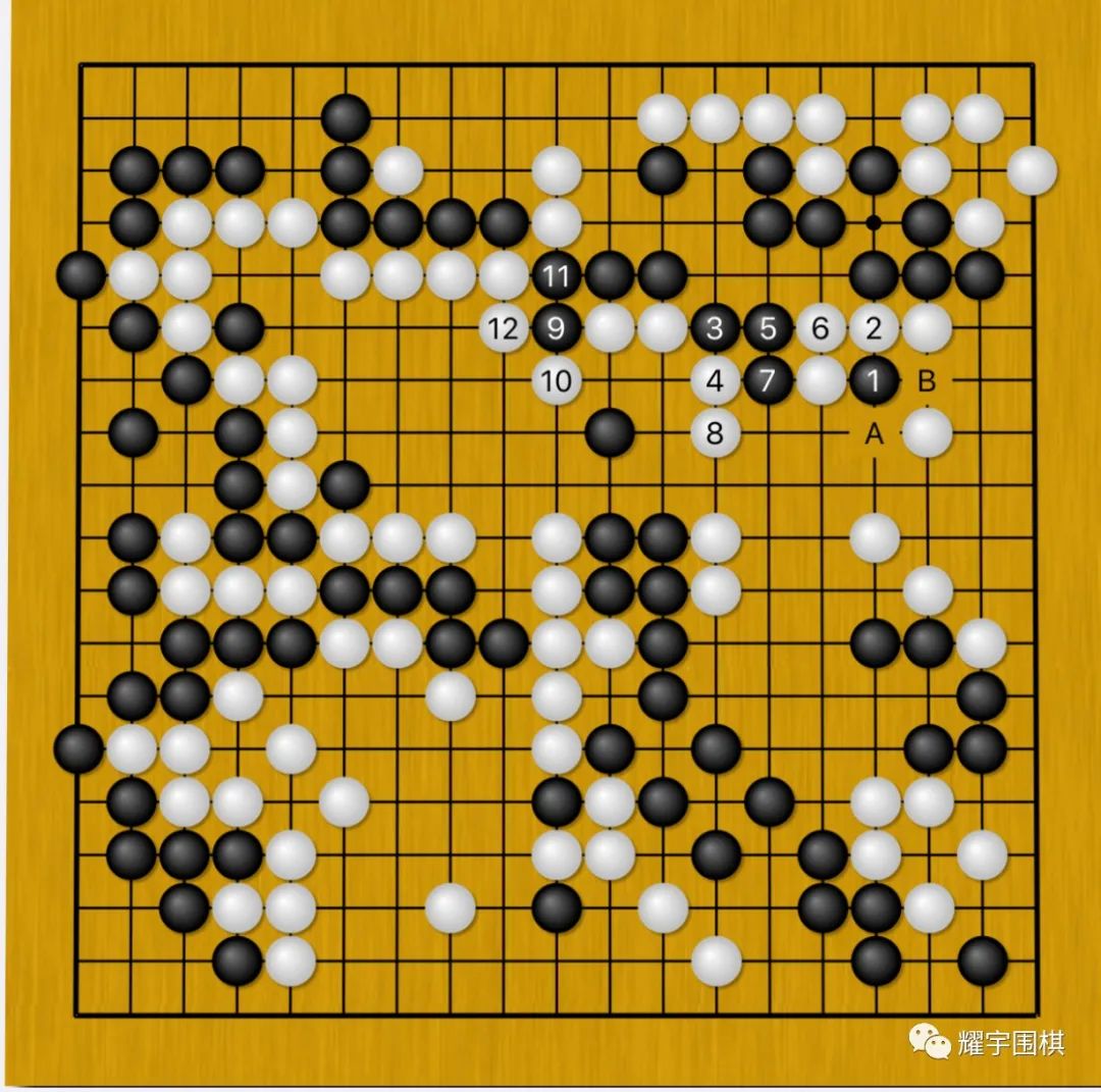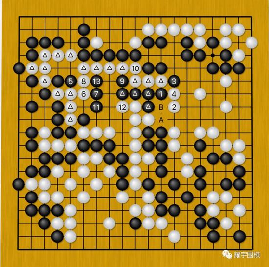 图14:当谢科黑173扳入时,柯洁白174没有在A位退,而是粘上最大限度围中央地盘,他就是觉得黑棋下一手不能B位长入。