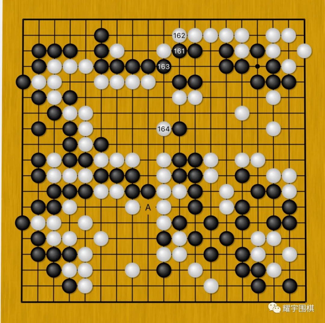 从事后来看,柯洁在下白164之前,应该先A位先手打掉。但职业棋手的本能,总想保留这个打吃,毕竟眼见的就亏损一枚大劫材。