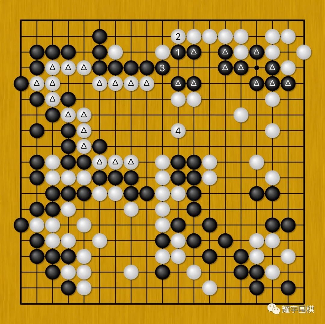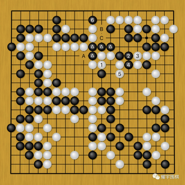 如此一来,谢科当初黑151的胜负手就获得了便宜。因为在右上黑三角大块生死无碍的情况下,黑151的价值要大于白152、154的价值。