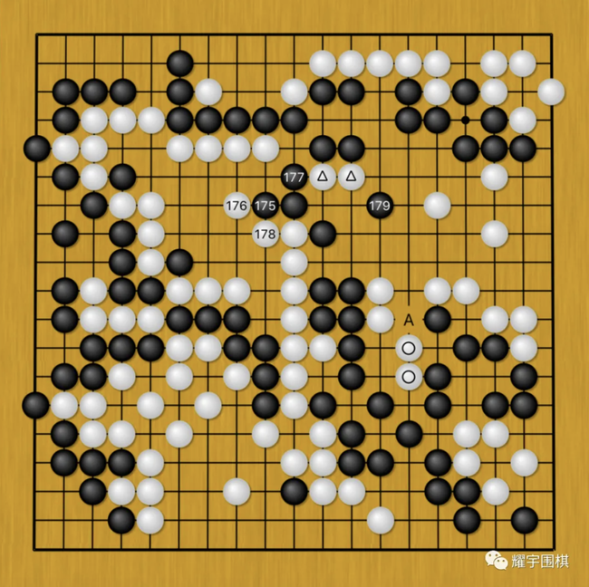 实战柯洁白176只好忍耐,但亏损已经在所难免。至黑179,黑棋不仅吃掉白三角两子,还因为自身厚实,生出了在A位挤吃白圆圈两子的手段。