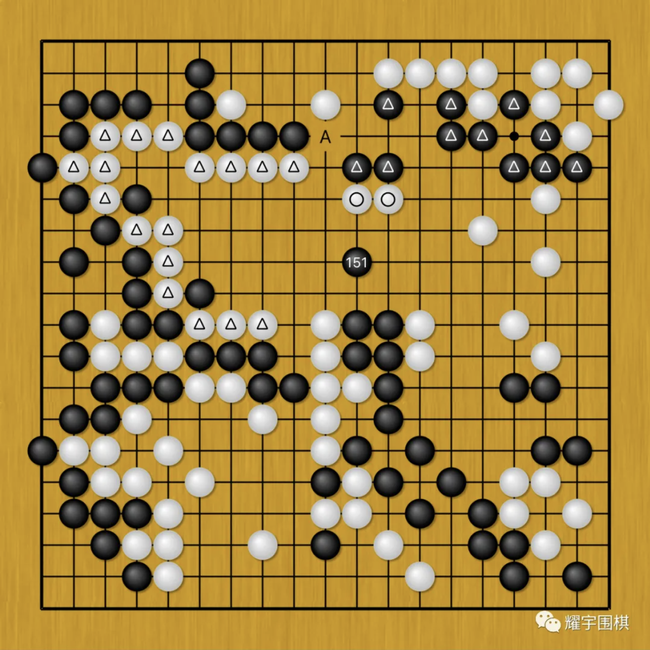 白150二路爬后,不仅将白三角一子连回,同时瞄着下一手在A位分断还未安定的黑三角大块。