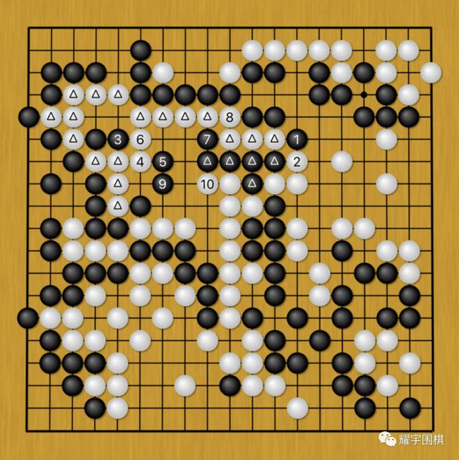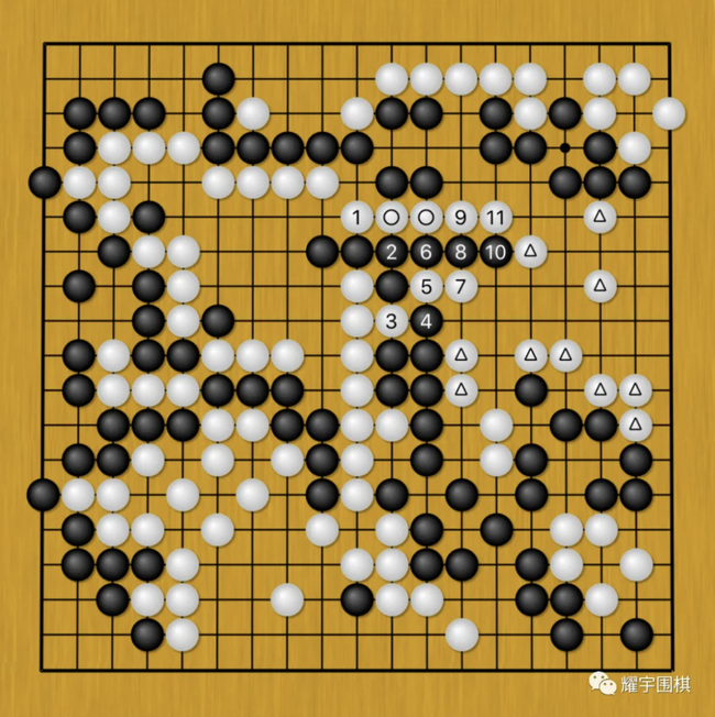虽然事后研究发现,接下来白棋若是应对无误,将是黑棋要完的节奏。但是其中的变化还是很复杂(由于篇幅原因就不深入展现了),就在棋盘上摆都觉得晕,更何况实战中是只能用心算。