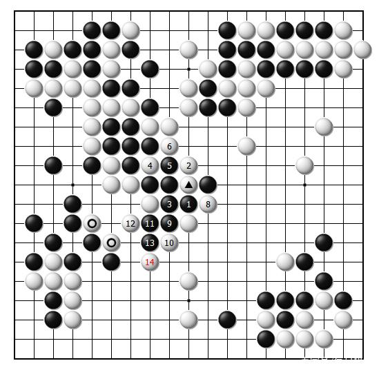 然而结论是,黑1小尖不成立,白2打吃正是时机,随后白6是人工智能都忽略了的妙手,至白12,黑棋无法逃脱。