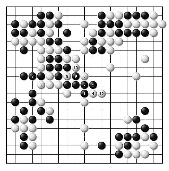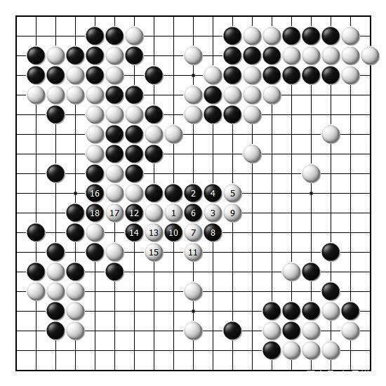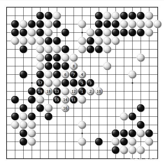 续上图。黑1到9是最强抵抗,白10是申真谞计算出,与AI推荐第一落点不同的招数,可以成功擒获黑棋。