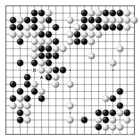 虽然看起来白棋的包围圈千疮百孔,但黑棋并不能轻易突围。例如,黑1断,白2简单一退,接着,黑A则白B,黑B则白A。