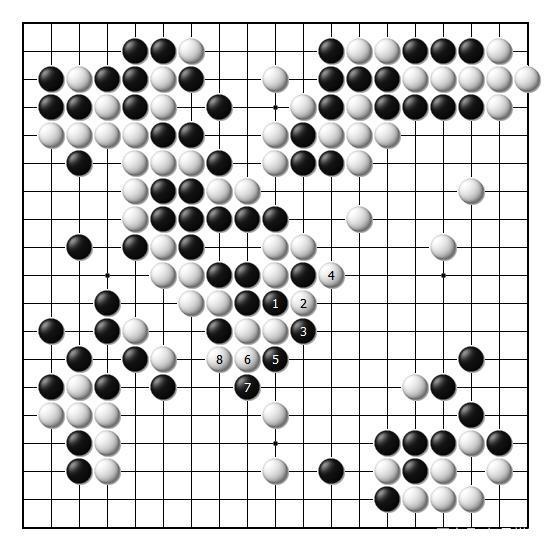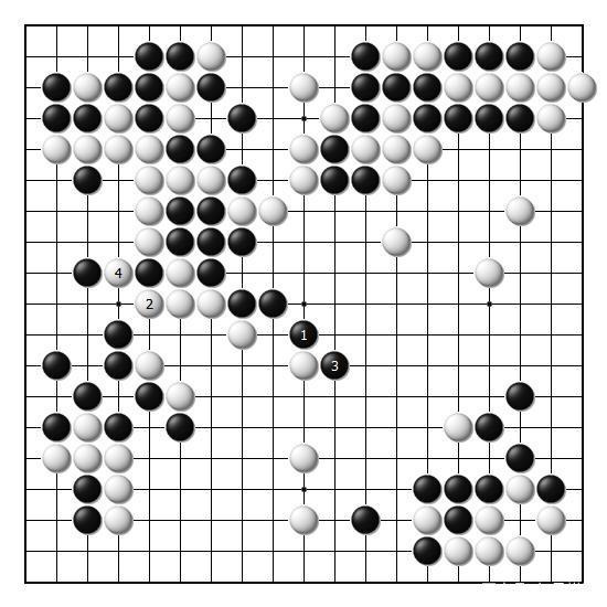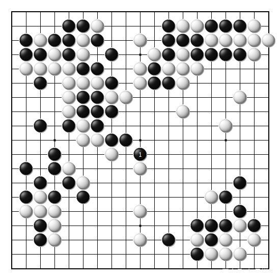 最终两位棋手在中腹骑虎难下的攻防战中形成了妥协,但是在提掉左边一颗黑棋之后,依然是双方两分的局面。事实上,这其中还有隐含的变化——