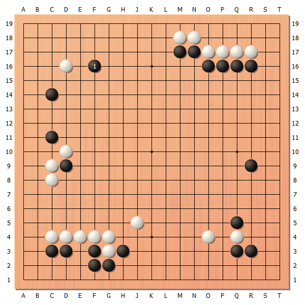 和之前的图进行比较,这个图上方的白棋和右边的白棋几乎连在一起,然后封锁了右上角的黑棋,任何人都觉得黑棋要更好一些。