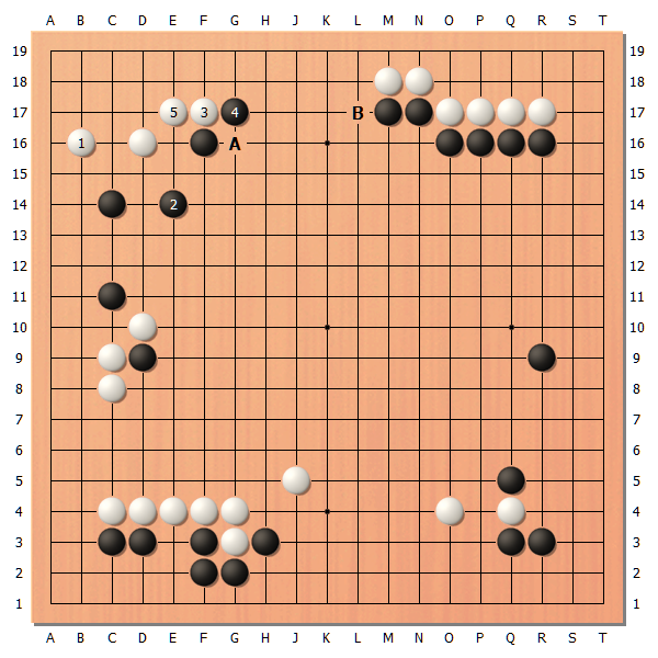通常来说,这个下法让黑棋变厚并不是很好,但是这个局面上方的价值很低,如果黑A粘上的话白B的扳是好调子。相较于之前的变化,白棋的角上实空更多,这样白棋可以满意。
