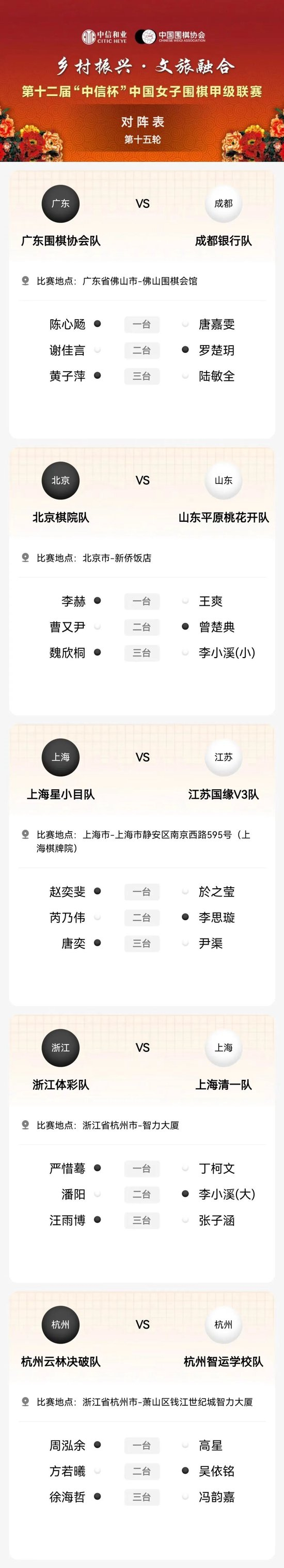 “中信杯”中国女子围棋甲级联赛第十五轮对阵表