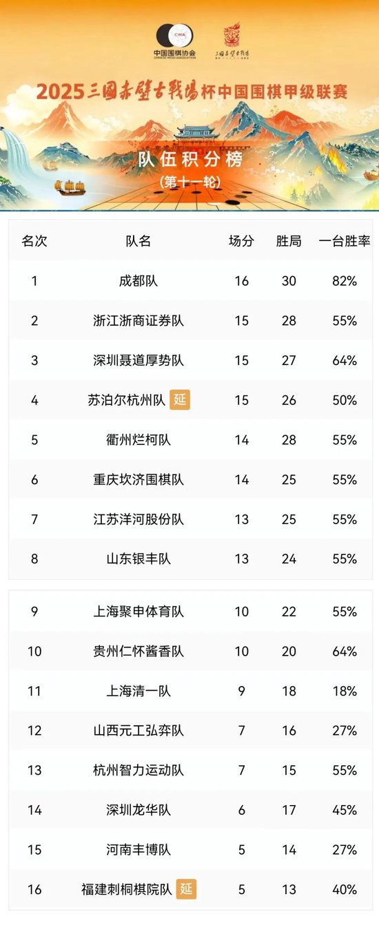 11月27日,2025三国赤壁古战场杯中国围棋甲级联赛第十一轮在上海、重庆、广东深圳、浙江杭州、四川成都各主场结束。浙江浙商证券队的檀啸九段十一连胜保持赛季不败。