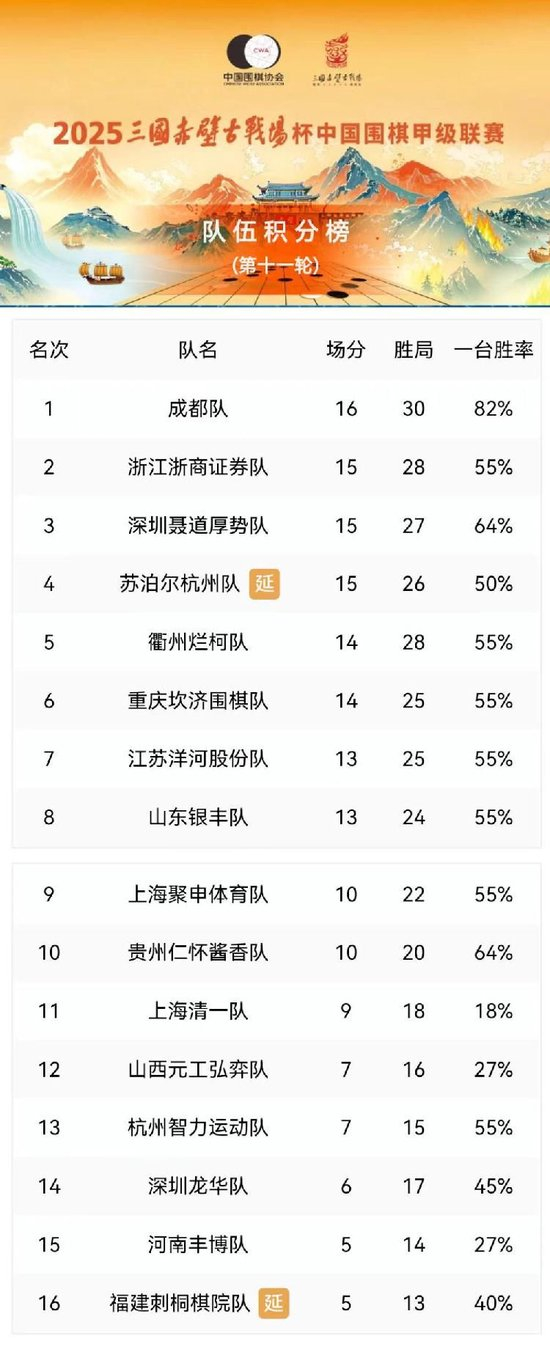 11月27日,2025中国围棋甲级联赛第十一轮在各主场鸣金,贵州仁怀酱香队客场挑战上海聚申体育队,最终两队各有胜负以2比2握手言和。凭借陈梓健与薛冠华的胜利,黔军成功从客场带走一分,并以此在积分榜上排名上升一位,暂列第十名。