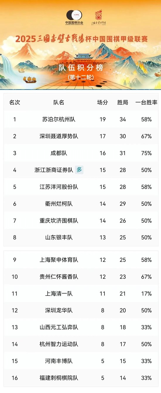 12月3日,2025三国赤壁古战场杯中国围棋甲级联赛第10轮补赛在中国棋院围棋会馆结束,福建刺桐棋院队陈豪鑫七段负苏泊尔杭州队丁浩九段,两队最终比分为0:4,苏泊尔杭州队目前以19分34胜局排在积分榜首位。